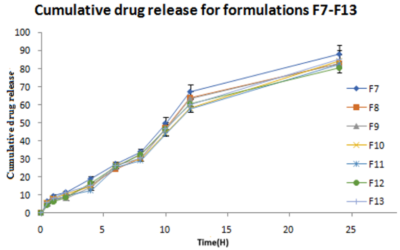 Fig. 7: %Cumulative drug release for formulations F7-F13, (All determinations were performed in triplicate and values were expressed as mean±SD., n=3)