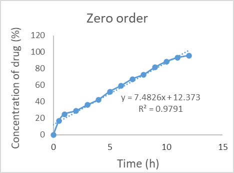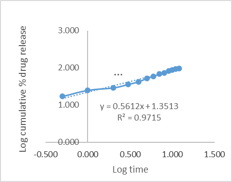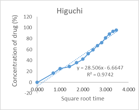 With the aid of a modified Franz diffusion cell, research on the in vitro release of several transfersome formulations was conducted. The cellophane membrane was fixed to a 2.5 cm diffusion area diffusion cell assembly. The receptor fluid was stirred at 100 rpm in a 22.5 ml phosphate buffer with a pH of 5.5 that was kept at 37±0.5 °C for the duration of the tests. The produced formulation was inserted into the donor compartment's membrane. At predetermined intervals, aliquots of the 2 ml sample were removed and promptly replaced with an equivalent volume of fresh diffusion medium [27, 28]. By that time, a graph of the drug release was calculated and plotted and shown in fig. 6 and 7.