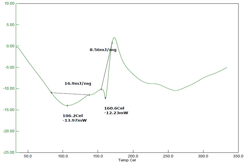 To determine the physical compatibility, a DSC was used to conduct a thermal examination of a few different drugs and polymer mixes. Amounts of the sample ranging from 1 to 2 mg were placed in sealed aluminium sample pans during each scan at a temperature of 10 °C/min in a nitrogen environment between 25 and 350 °C. As a guide, an empty aluminum pan was used [33].