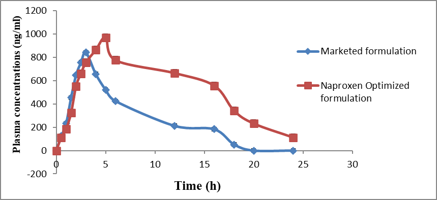 Fig. 15: Comparison of plasma drug concentrations for marketed formulation and naproxen-optimized formulation, (All determinations were performed in triplicate and error bars were omitted)
