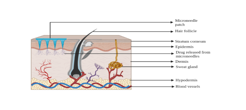 The skin is the largest organ and covers about 15% of body weight. It has a total surface area of around 20 square feet. The skin shields us from the detrimental effects of ultraviolet light. It also serves as a barrier against thermal, mechanical, and physical as well as frightening substances that allow for the sensations of touch, heat, and cold and help regulate body temperature. Fig. 1 illustrates the three layers that make up the skin. (1) The top layer of skin, called the epidermis, has a barrier known as the "Stratum Corneum" that prevents the administration of drugs transdermally. It is composed of living cells without a circulatory network 150–200 µm in thickness. Passive diffusion through interstitial fluid satisfies this layer's nutritional needs [7]. (2) Dermis-The innermost layer of the skin is made up of connective tissue from a mesh of collagen and elastin fibers, which provides strength and elasticity to the skin. (3) Hypodermis-also known as the subcutaneous layer, forms the middlemost layer of the skin, which is located just beneath the dermis and provides cushioning, insulation and support to the tissues [8]. Few potent pharmacological substances with high lipophilicity and low molecular weights (less than 500 Da) can be supplied directly through passive diffusion since the topmost layer of the epidermis is made mostly of dead cells [9–11]. Researchers are developing microneedle-based transdermal drug delivery systems to enhance the pharmacokinetic and pharmacodynamic properties of currently available medicines. As a result, Microneedles were created in response to the requirement for a low-cost, repeatable technique of delivering medications to the epidermal layer without harming nerve cells or raising the possibility of microbial penetration.