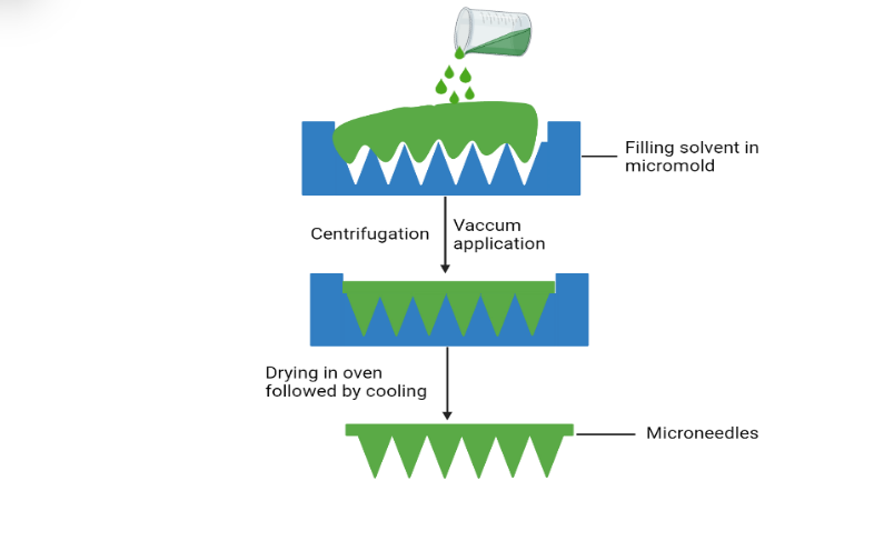 | Micromolding and melt casting method | Using this technique, a microneedle mold is initially crafted from a silicon wafer. This wafer is then oxidized at1000 °C. Subsequently, the liquid polymer solution is filled into the pre-arranged molds, and any air gaps are eliminated either by vacuum or centrifugation. After this process, the molds are dried in an oven. The microneedles are removed after they have cooled, as shown in [fig. 4]. | [26] |