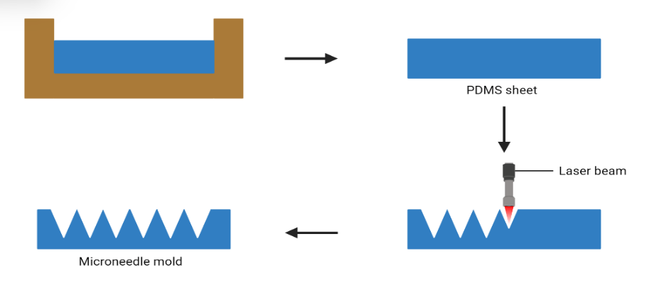 | Laser Ablation | Laser ablation, similar to laser cutting, is employed to produce solid metal arrays. Not only stainless steel but also metals like tantalum can be manufactured using this method. After three such pulses, this bulge transforms into a needle approximately 10 μm in height. Further applications of twisted light pulses can refine the microneedles, achieving a tip diameter of under 0.3 μm | [28] |