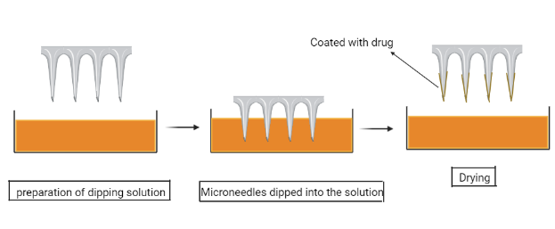| Dip coating | Dip coating is the easiest method for coating microneedles. In this method, the microneedles are first dipped in drug solution and then withdrawn, resulting in the development of a liquid coating on the surface of the microneedle; after that, the liquid layer is allowed to dry, resulting in a solid film covering on the microneedle tips without any contamination. To administer hydrophilic and hydrophobic medicines, the dip coating approach has been used. Dip coating has the disadvantages of being a slow process and the possibility of deterioration [fig. 6]. | [28] |