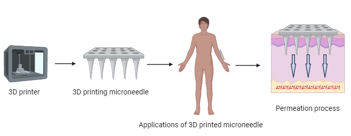 Microneedles manufactured in three dimensions (3D) are an exciting advancement in the biomedical and medication delivery industries. Because they provide a minimally intrusive technique for medication delivery, immunization, and diagnostic applications, microneedles, which are small needles typically ranging from hundreds of micrometers to a few millimeters in length, have the potential to revolutionize several medical operations 3D printing technology in microneedles, and its diagrammatic representation is shown in fig. 7.