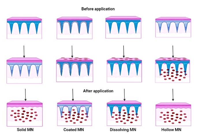 Microneedle-based transdermal medication administration is a revolutionary drug delivery technique that has advantages over parenteral and oral drug delivery systems. They are convenient, painless, safe, and effective. Due to the skin’s stratum corneum layer, the majority of drugs only have a limited impact, which constitutes a thickness of about 10 to 15 µm and acts as a barrier for molecules to reach the site of action, allowing just a few molecules to pass through. To overcome this, many researchers have concentrated on using microneedles to bypass the stratum corneum barrier. The main goal of microneedles is to get the drug into the epidermis without disrupting nerve endings. Micron-sized channels created by the skin layer being broken by microneedles transport the medication directly to the epidermis or higher dermis, avoiding the barrier layer and into the systemic circulation. As a result, the microneedle can improve transdermal drug delivery. Microneedles are fabricated in different forms, such as “Solid Microneedles,” “Coated Microneedles,” “Dissolving or Biodegradable Microneedles,” “Hollow Microneedles” and Hydrogel-forming Microneedles, through the use of components including polymers, polysaccharides, silicon, and metals. Micromolding, laser cutting, dip coating, 3D printing and its techniques are just a few of the processes used to make microneedles. Recently, microneedles have become popular for delivering drugs, genes, proteins, RNA and vaccines, demonstrating significant therapeutic effects. A variety of nano-carriers, along with different delivery methods, assist in emphasizing the use of microneedles in the meantime.