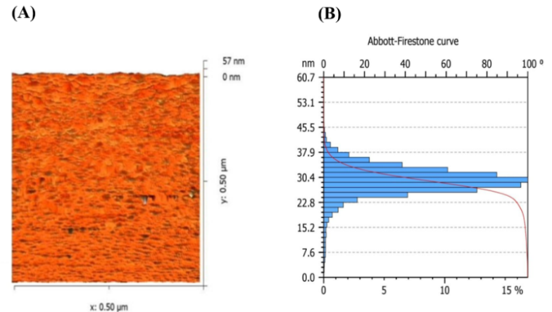 The morphological analysis and particle size of NS-VRZ performed by AFM revealed regular to spherical-shaped nanoparticles with a size of (35.6 nm) and approved by the histogram of particle size distribution as seen in fig. 1. In contrast, the particle size estimated by the ABT-9000 particle size analyser was 61.35 nm. The particle size of the optimized NS-VRZ obtained by AFM was smaller than that measured by the ABT-9000 particle size analyser and this difference because a particle size analyser could, only, provide data on the volumetric mean diameter of a large number of particles; it is challenging to get findings that reflect actual size distribution.
