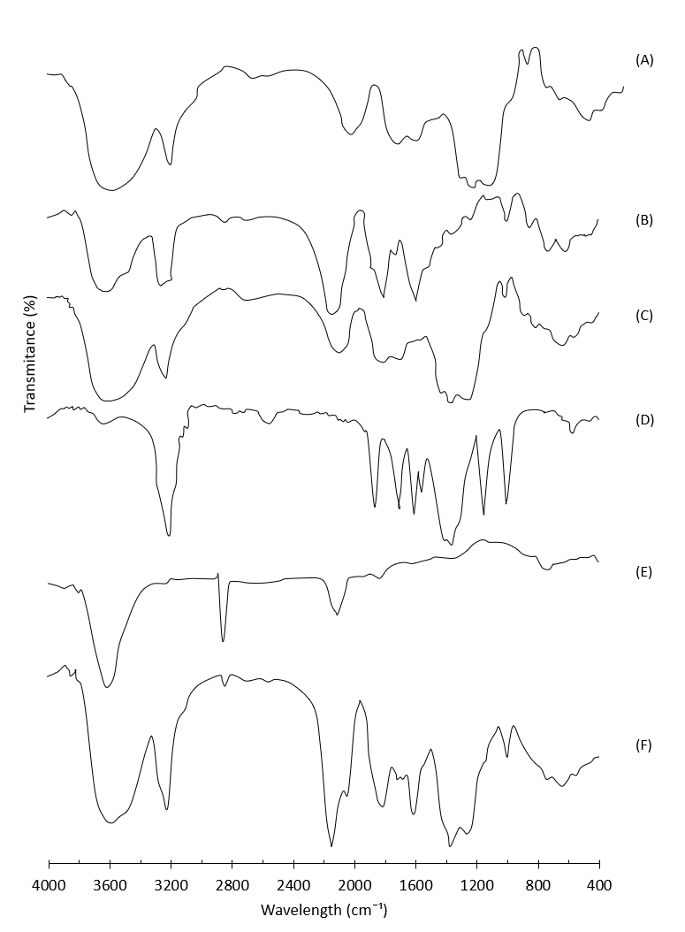 Fig. 2: FTIR images (A) pure VRZ compound; (B) PVP K-30 polymer; (C) HPMC E5 polymer; (D) PXM 188 polymer; € Nanosuspensions-free VRZ; and (F) NS-VRZ