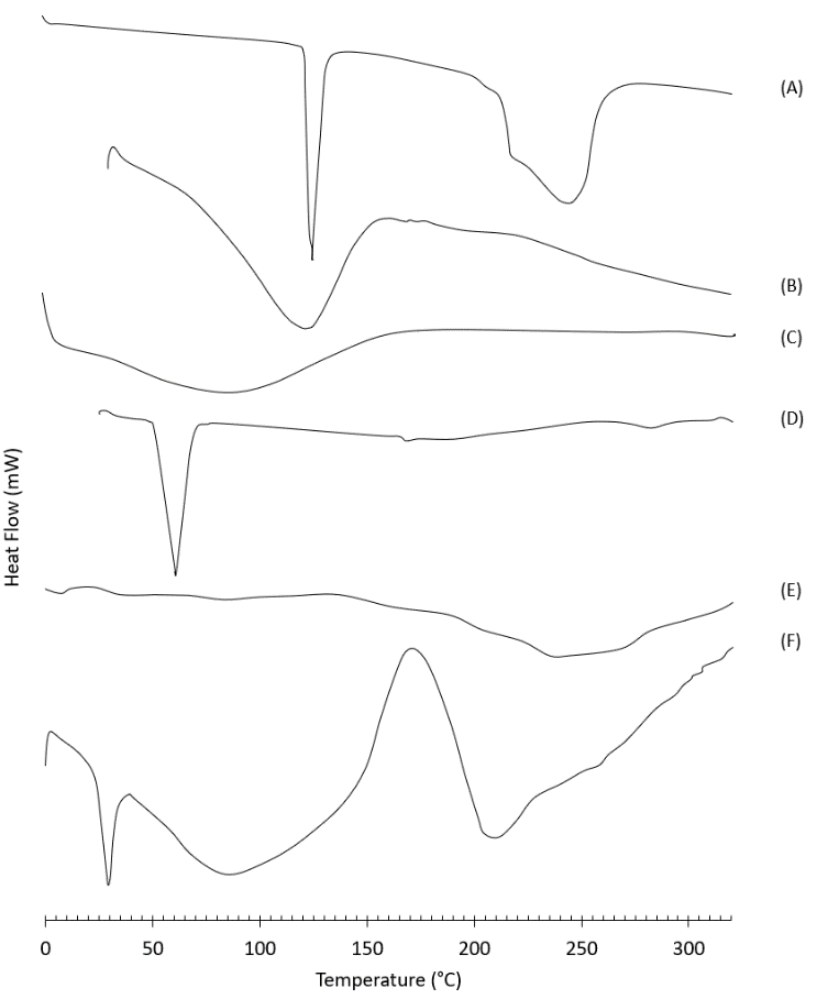 Fig. 3: DSC thermogram of (A) pure VRZ; (B) PVP K-30; (C) HPMS E5; (D) PXM 188 (E) Nanosuspensions-free VRZ (F) NS-VRZ