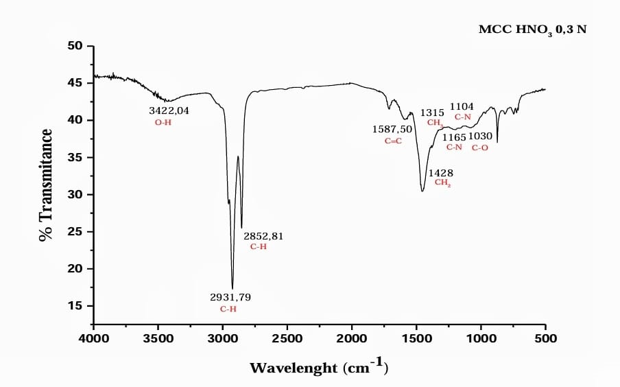 There were two sharp peaks at wavelengths 2931.79 cm-1 and 2852.81 cm-1, which are thought to be originated from the C-H functional group of cellulose and lignocellulose, whereas when compared with the FTIR spectrum of Avicel® PH 102 they are only found at wave number 2898 cm-1. This was due to the purity level of MCC was not optimal in accordance with the yield value obtained at 66.20%. However, the FTIR spectrum had shown that the resulting compound was MCC (fig. 1).