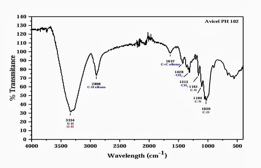 FTIR was used to characterize the functional groups in microcryatalline obtained from Sago stem bark compared with that from AVICEL PH 102 as standard. Spectra of FTIR was conducted using FTIR Alpha with detector RT-DLaTGS ZnSe and scanned at 500-4000 cm-1 [31].