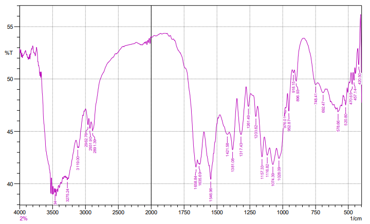 Fig. 3: Nano chitosan 2% with FTIR spectra of Portunus pelagicus shell waste