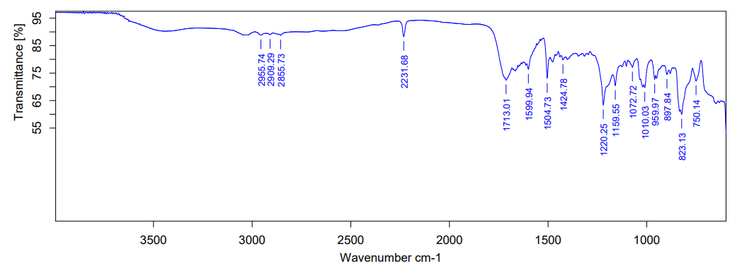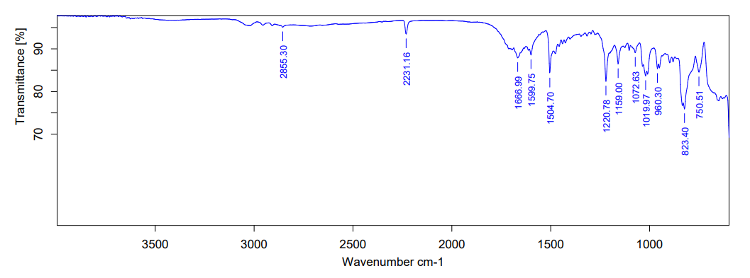 The FTIR of ESPO and ESPO optimized formulation are shown in fig. 2. The sharp peak obtained at 2855.30 cm-1 represents C-H stretching, a sharp peak at 2231.16 cm-1 was due to C≡ N stretching vibration, a broad peak at 1599.75 cm-1 represents C=O stretch, peak at 1220.78 cm-1 represents C-F stretching and a peak obtained at 1159.75 cm-1 was due to C-N stretching. The same characteristic bands were observed in the ESPO film composition indicating that there was no physical incompatibility in between the ingredients used to develop the films.