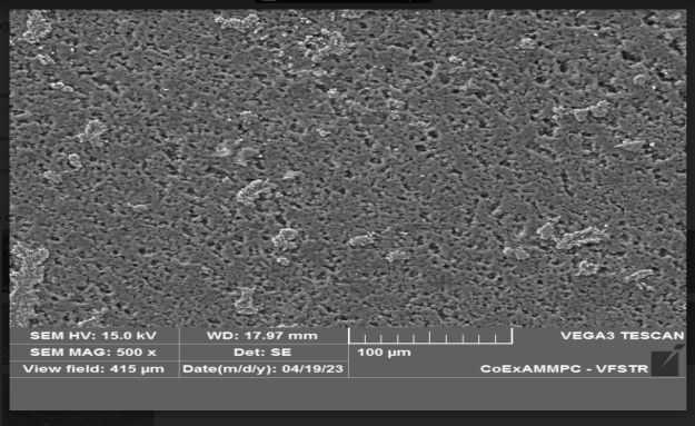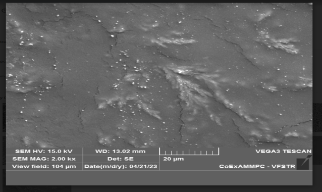 The surface morphology of pure ESPO and optimized films of ESPO was observed by scanning electron microscope at an accelerating voltage of 0.5-30kv, resolution of 3.5 nm and magnification of 500X-2000X [28].