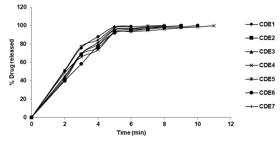 Fig. 3: In vitro drug dissolution profile of ESPO ODFs (CDE01-CDE07)
