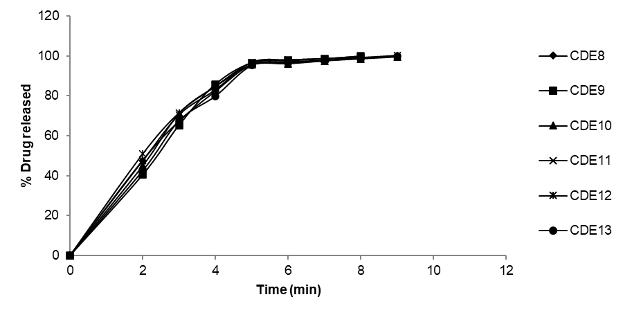 Fig. 4: In vitro drug dissolution profile of ESPO ODFs (CDE08-CDE13)