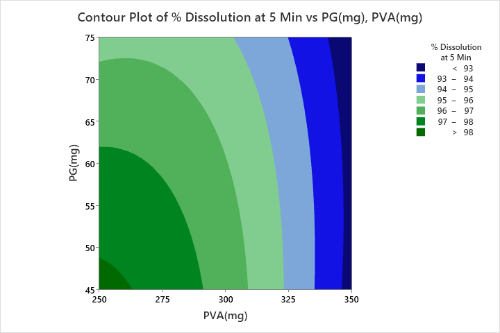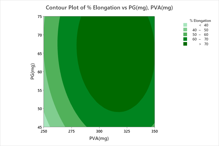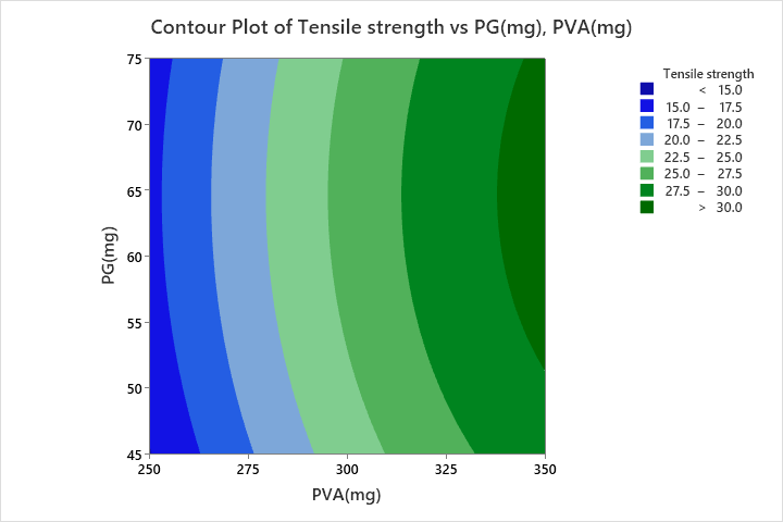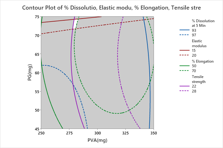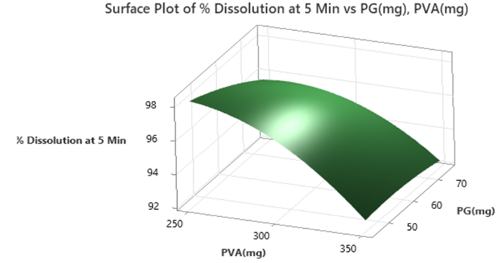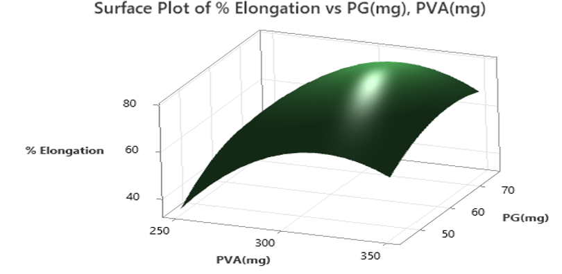Quadratic model was suggested to tensile strength, Percent elongation, elastic modulus and percent dissolved at the end of 5 min (% D5 min). All the responses were fitted to quadratic model. In case of tensile strength and percent elongation, two squared effects and two linear effects were observed. In case of elastic modulus two linear effects and one squared effect (PG*PG) were identified as significant, so reduced model equation was generated. Similarly, in case of % D5 min, two linear effects and one squared effect (PVA*PVA) were identified as significant, so a reduced model equation was generated. In all the responses interaction effects are not significant.