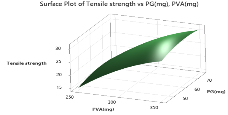 Y1= Tensile strength = 25.5856+7.0515(PVA)+0.742(PG)-1.8234(PVA)2-1.1659(PG)2