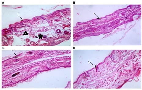 Fig. 6: Histological changes observed in the ear skin of rats, a) Positive group (acne-induced) with inflammation (black arrow), comedones (marked with star) edema and sebaceous gland dilatation (marked with black triangle) b) Clindamycin treated group, with reduced inflammation (black arrow), decreased leukocyte infiltration with almost no acne c) EETC formulation (500 mg/kg) treated group with reduced inflammation (black arrow), and edema d) EETA formulation (500 mg/kg) treated group with decline in inflammation (black arrow), and edema