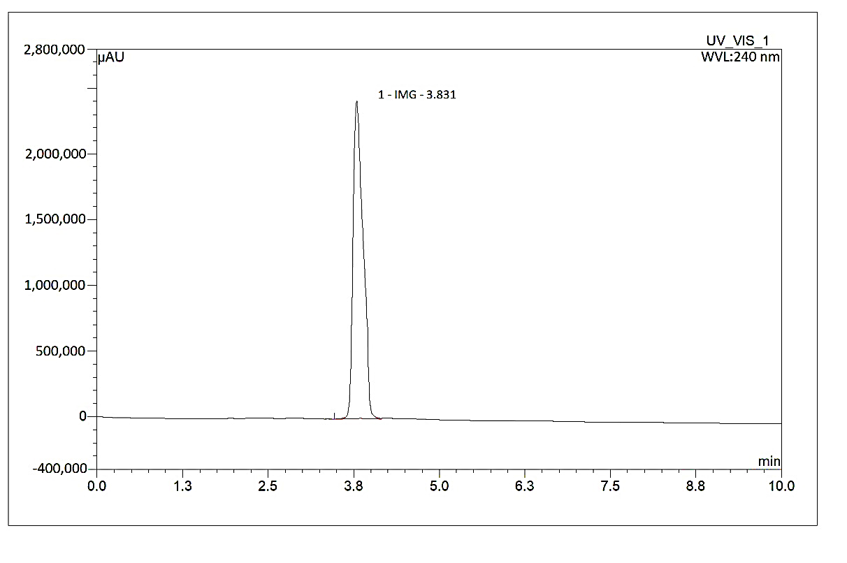 To optimize chromatographic conditions different ratio of water, methanol and acetonitrile were tested in isocratic mode to achieve acceptable resolution, peak shape, efficiency and retention time. Finally, water: acetonitrile combination in ratio of (15:85) with the flow rate of 1 ml/min. with isocratic elution was selected because of greater optimized results. ODS and phenyl column were tried during the optimization of the method but the end capped ODS column relatively produces good symmetry and performance with a photo diode array detector. The wave length of 240 nm was selected to produce maximum absorbance and sensitivity. By using above condition, we get retention time of 3.831 minute for Imeglimin with tailing factor of 1.14. The number of theoretical plates for Imeglimin was found to be 3343 which indicates excellent column efficiency and the %RSD for the six replicate injections was found to be around 0.246. The developed approach suggested that it is highly precise and validated in accordance to ICH-Q2(R1) guideline.