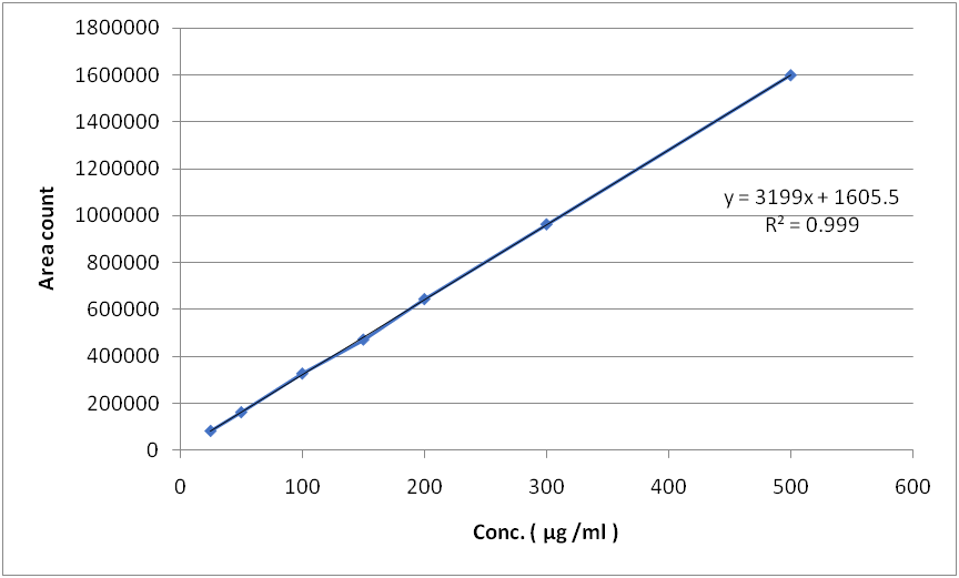 A series of solutions over the range of 25,50,100,150,200, 300 and 500μg/ml for Imeglimin were prepared and 20μl of each solution was injected into UHPLC system and peak area of the chromatograms were noted. Calibration curve was plotted against the concentration of the dilutions on the x-axis and corresponding peak areas on the y-axis. This will yield slope and intercept value of the regression line. Linearity was noted in the range of 25-500μg/ml. The regression equation is y=3199x+1605.5 with a correlation coefficient (R2)>0.999, which shows excellent linear correlation. Linearity data are tabulated in table 2.