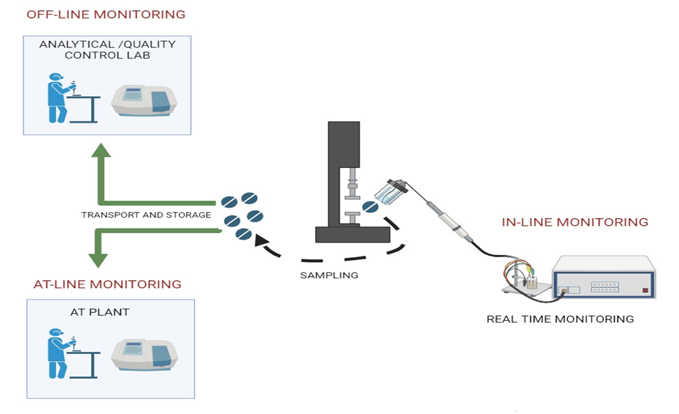 The process of manufacturing can be monitored by four methods (fig. 1): a) Off-line monitoring, b) At-line monitoring, c) In-line monitoring, and d) Online Monitoring.