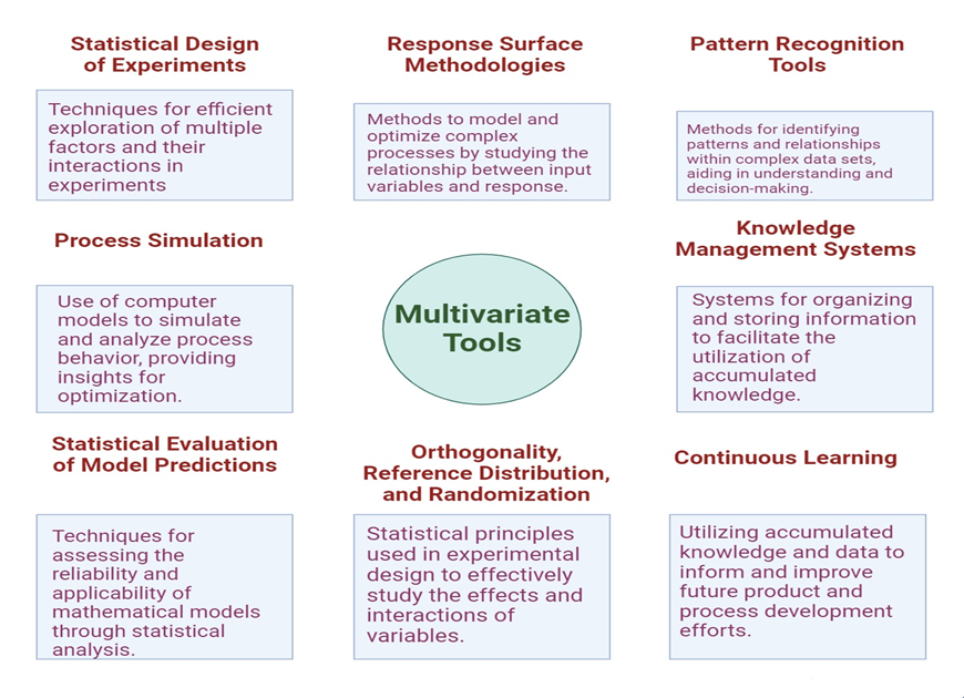 There are several tools available to aid understanding of processes in scientific, risk-controlled pharmaceutical research, production, and quality assurance. When incorporated into a system, these technologies provide productive and simplified avenues for acquiring information, assisting with process comprehension, continuing improvement, and the development of risk-mitigation measures. These instruments are classed as follows under the Process Analytical Technology (PAT) framework: Multivariate tools (fig. 2), Process analyzers, Process controlling Tools, and Continuous improvement tools.