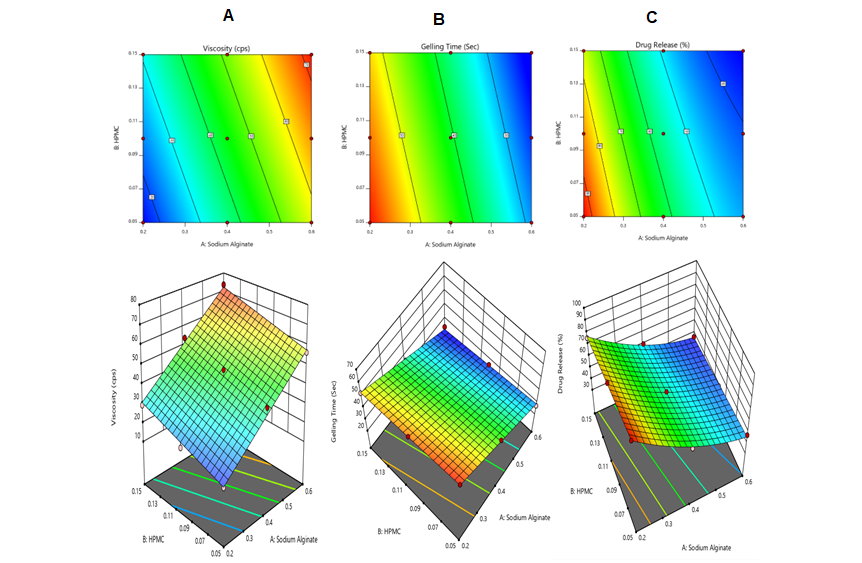 Fig. 1: Contour and 3D response surface plots of (A) Effect of sodium alginate and HPMC K4M on viscosity (B) Effect of sodium alginate and HPMC K4M on gelling time (C) Effect of sodium alginate and HPMC K4M on in vitro drug release. HPMC K4M: Hydroxypropyl methylcellulose