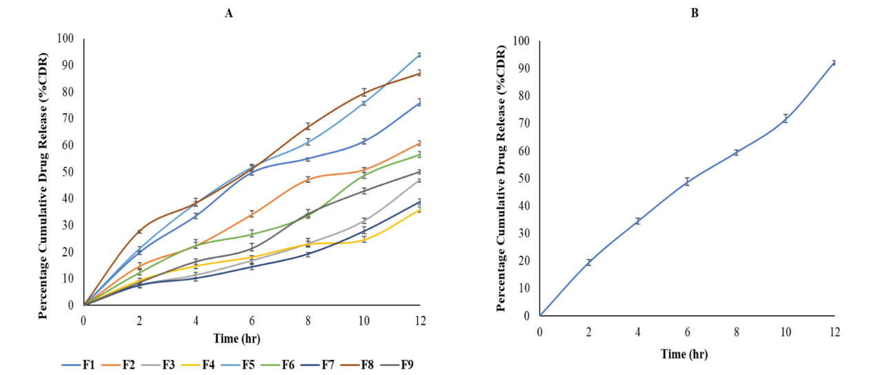 Fig. 2: In vitro diffusion study of (A) cromolyn sodium in situ formulations (B) optimized formulation. The presented data is expressed as mean±SD (n=3); n denoting total number of observations