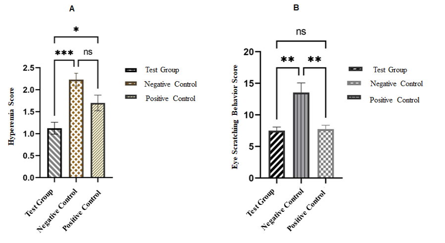 Fig. 3: Comparative scores of the test group, negative and positive control of (A) eye scratching behaviour (B) hyperemia (***p<0.001) (*p<0.05) (**p<0.01). The presented data is expressed as mean±SEM (n=6); n: denoting total number of observations
