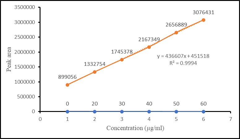 Standard solution of Eplerenone at different concentrations were prepared and their peak area was determined by HPLC, calibration curve was built by plotting the concentrations levels of drug ranges from 10-60 µg/ml in x-axis versus the corresponding peak area in y-axis, as shown in table 1. The correlation coefficient of Eplerenone is 0.9994 and hence the curve is said to be linear with y= 436607x+451518 as shown in fig. 1.