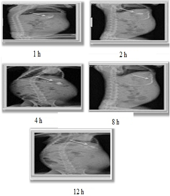 Barium Sulphate helps to uncover dosage form in the GIT by which one can predict and correlate the gastric emptying time and the passage of dosage form. In gastro-scope and ultrasonography studies can be included in the in vivo evaluation of gastroretentive drug delivery systems [28]. The scintigraphs showed that all the formulations were intact in the physiological environment of stomach as depicted in fig. 2. Gamma scintigraphy study was performed to evaluate qualitative gastro retention following oral administration of barium sulphate formulations and to support quantitative pharmacokinetic outcomes. The images were captured at 1, 2, 4, 8 and 12 h post-administration. The rabbits showed an accumulation of microspheres at 1 h, which reached to maximum at 24 h showing prominent retention in gastric environment [29].