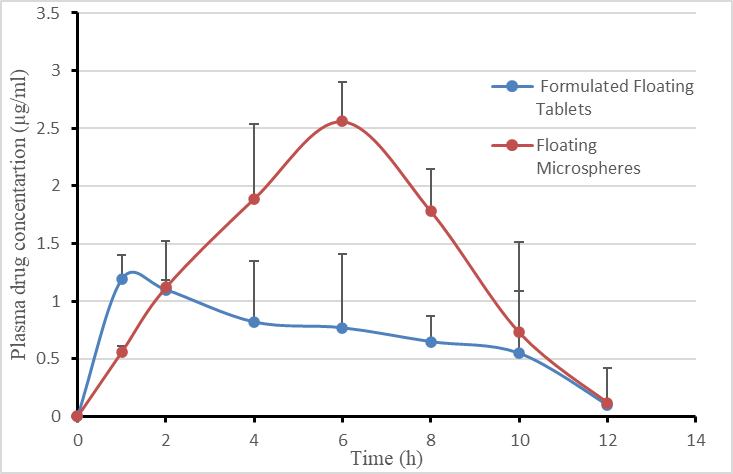 The correlation coefficient of Eplerenone is 0.9994 and hence the calibration curve was said to be linear. The formulation development and in vivo studies of Eplerenone shows better pharmacokinetic properties for its sustained action. For comparison, a formulated floating tablet of Eplerenone was used in the study. In the present studies peak plasma concentration of (Cmax) floating microspheres was found to be 1.17µg/ml against 1.29 µg/ml for floating microspheres of Eplerenone, time to reach peak plasma concentration (t-max) for floating tablet was 1.5 h, against 6 h for formulated Eplerenone floating microsphere. The area under the curve AUC for formulated floating tablet was 9.69 µg/ml, whereas for Eplerenone floating microspheres, it was 16.28 µg/ml, formulated floating tablet absorption rate constant Ka was 1.61 h and for optimized formulation, it was 0.5 h-1. Elimination rate constant was 0.112 h and 0.053 h for formulated floating tablets and optimized formulation, respectively. Elimination half-life was found to be 6.2 hand 12.98 h for formulated floating tablets and optimized formulation, respectively. The results of Peak are and concentrations were depicted in table 2 and the results of pharmacokinetics analysis were depicted in table 3 and fig. 3.