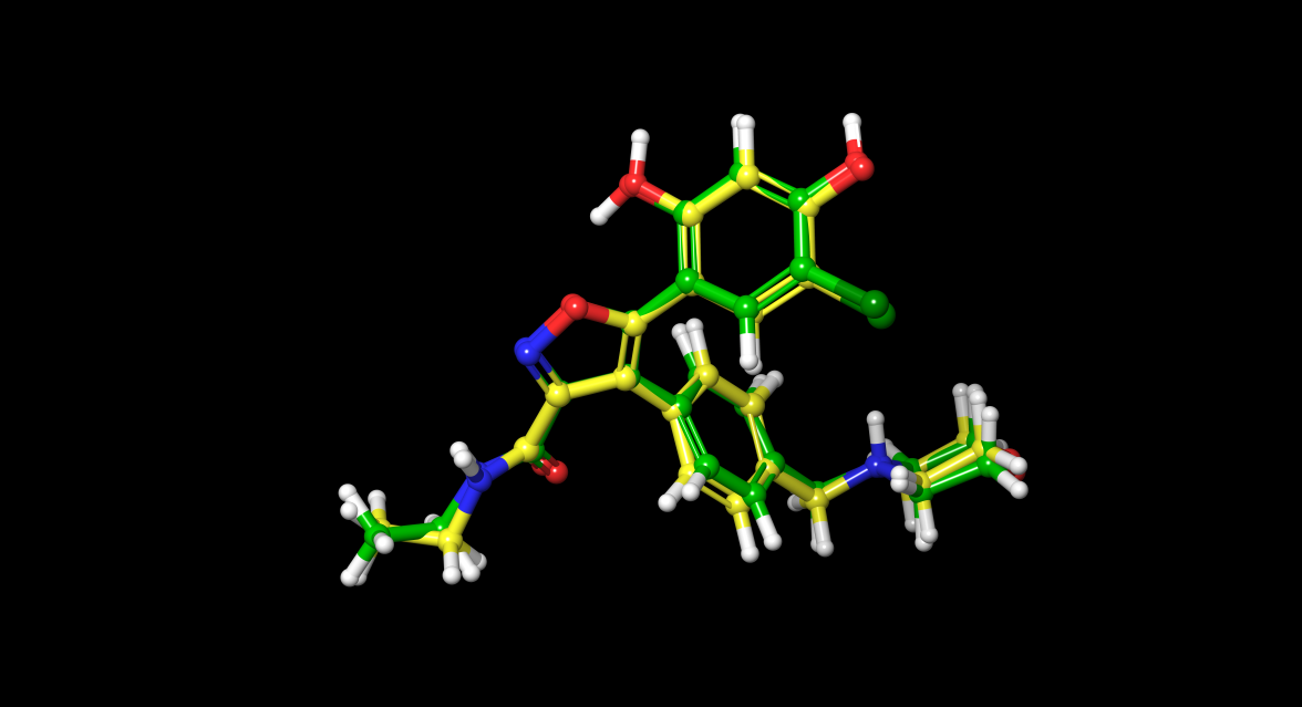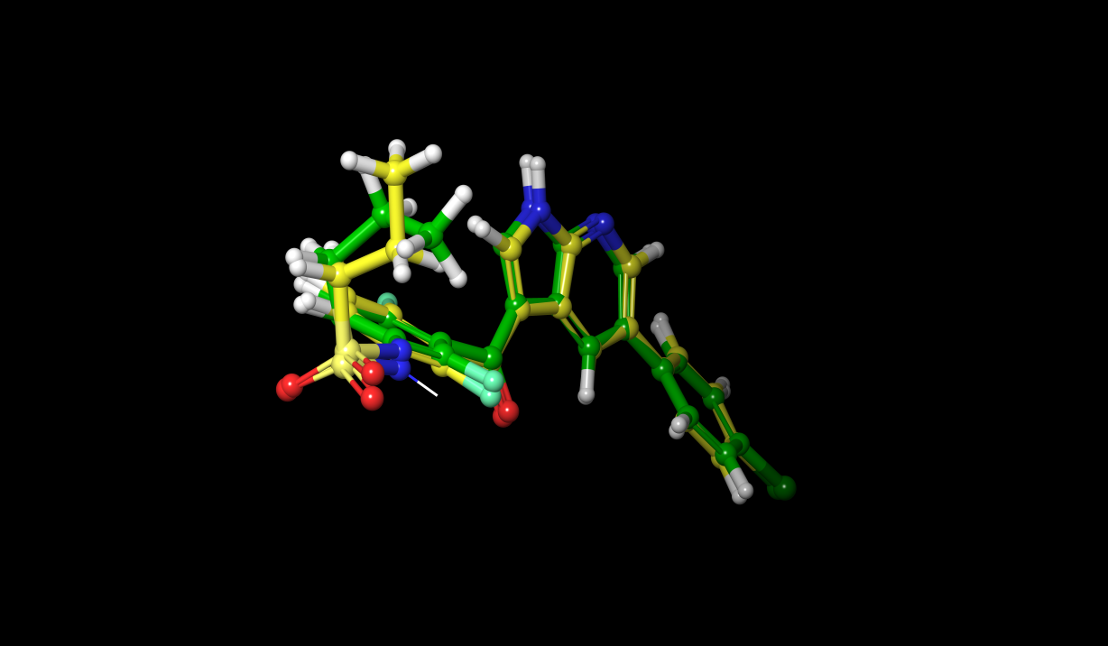 Fig. 1: Superimposition of the re-docked conformation (Yellow) and crystal structure conformation (Green) a) 2VCJ b) b) 3OG7