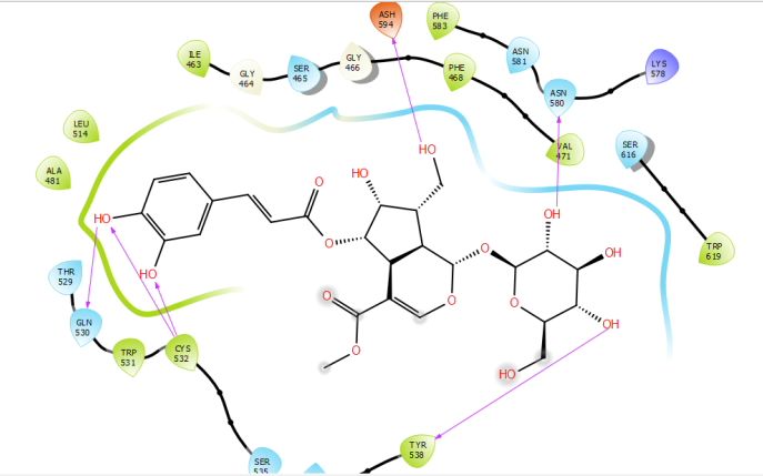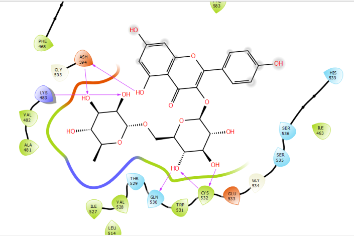 | 5282102 (Astraglin) | -10.681 | -73.205 | -76.60 | CYS532 THR529 ASH594 SER465 |