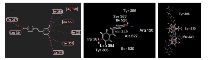 | U13 | Resveratrol-10-C-β-glucopyranoside | -44.5909 | -84.9482 | Tyr385, Leu531, Val349, Leu384, Tyr355, Ile523, Met522, Leu384, Trp387, Ser530, Gly526, Ala527 |