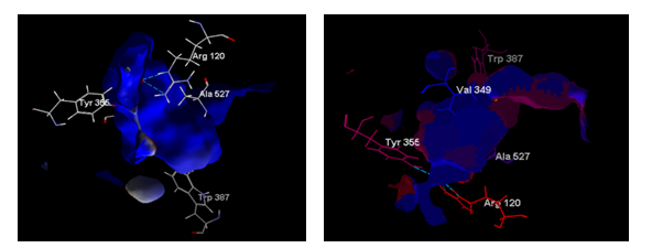 In fig. 2(a), It can be explained that the electrostatic surface describes the relationship between the partial charge and the receptor bonds. Meanwhile, in fig. 2(b), it can be explained that the surface of the protein (residue) is hydrophobic, as shown on the blue surface of the residue. In contrast, the red surface indicates that the residue is hydrophilic.
