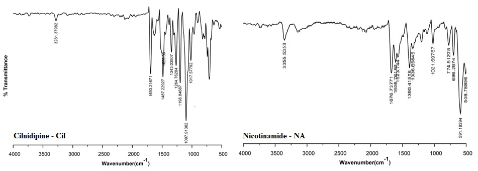 The Cilnidipine showed the characteristic peaks at 3281 cm-1 (N-H stretching), 1693 cm-1 (-C=O stretching) and 1525 cm-1 (N-O symmetrical stretching) and 1343 cm-1 (N-O asymmetrical stretching) and that of Nicotinamide at 3355.53 cm-1 (-N-H asymmetrical stretching), 3147.48 cm-1 (-N-H symmetrical stretching), 1676.73 cm-1 (-C = O stretching) and 1608.76 cm-1 (-N-H bending) [9].
