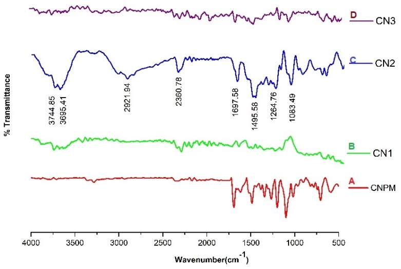 Fig. 2: FT-IR Spectra of (A) Physical mixture of cilnidipine and nicotinamide (CNPM), formulations of cilnidipine-nicotinamide in the molar ratio: (B) 1:0.5-CN1, (C) 1:1-CN2, (D) 1:2–CN3