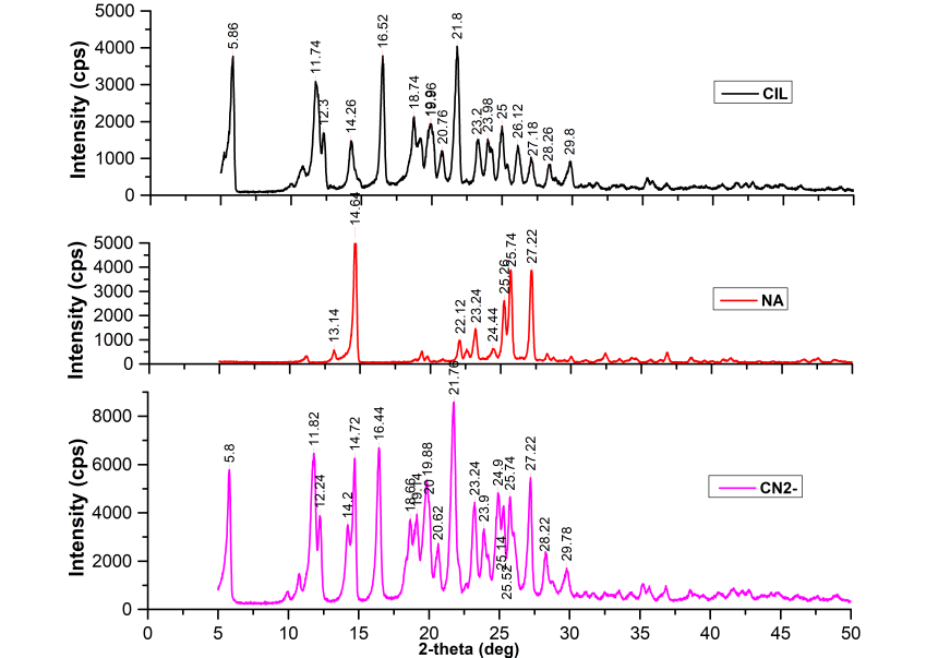 PXRD analysis is used to study changes in the crystal lattice of molecules, making it a valuable tool for characterising cocrystals. When there is a crystal lattice change, a molecule's unique PXRD pattern is altered [32]. The PXRD pattern of Cilnidipine (CIL), Nicotinamide (NA), and the cocrystal CN2 are given in fig. 4. The characteristic 2θ positions of Cilnidipine are 5.86°, 11.74°, 12.3°, 14.26°, 16.52°, 18.74°, 19.96°, 21.8°, 25.0°, 26.12°, while the peaks for Nicotinamide are 13.14°, 14.64°, 22.12°, 25.26°, 25.74°, and 27.22°. The CN2 exhibited peaks at 5.80°, 11.82°, 14.72°, 16.44°, 21.7°, 23.24° and 25.74°. The 2θ positions of CN2 are more intense, unique and different from its components, which confirm the formation of a new crystalline phase.