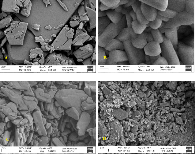 Fig. 5: FESEM images of (A) Cilnidipine (B) Nicotinamide (C) Physical mixture (CNPM) and (D) Cocrystal formulation (CN2). (Magnification: 5.00K X; resolution: 2 µm)