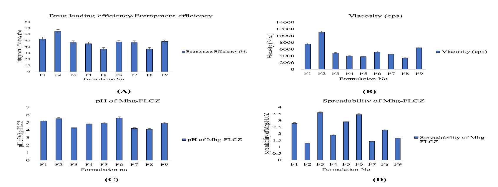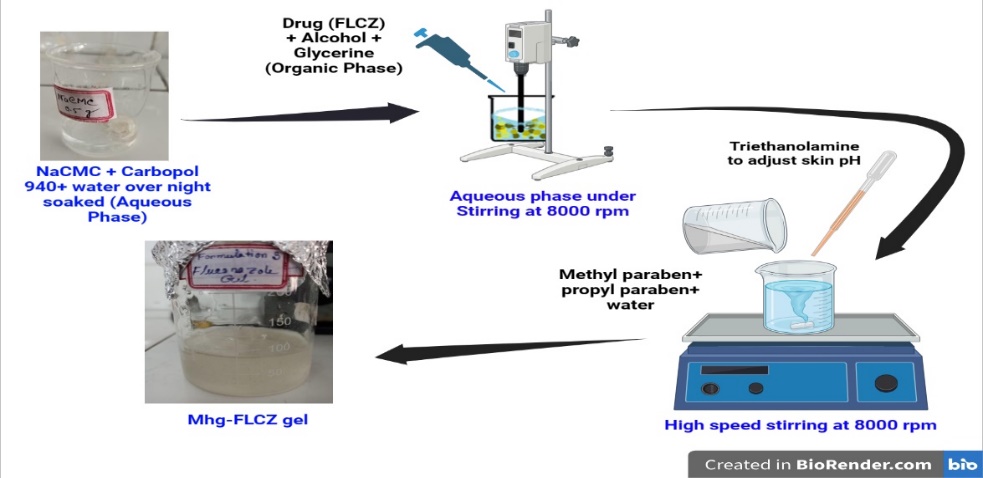 All 9 formulations of FLCZ topical gel were prepared using different concentrations of Carbopol 940 (CP) and NaCMC using the modified swelling hydrogel method [8, 9]. The composition of different formulations of Mhg-FLCZ is presented in table 1. CP and NaCMC were soaked overnight at different concentrations. The organic phase was prepared using a drug (FLCZ) dissolved in 10 ml of methanol and glycerin. Organic phase transfer drop by drop through a micropipette to an aqueous phase containing CP and NaCMC makes oil in water (o/w) using a magnetic stirrer with the speed of 8000 rpm. Alcohol (methanol) was utilized to improve penetration while glycerin served as a moisturizing ingredient. Allow to hydrate and swell slowly addition of methyl paraben and propyl paraben sodium under stirring of 8000 rpm. To adjust the skin pH, triethanolamine was used and the content was overnight at room temperature to get a homogenous gel of Mhg-FLCZ.