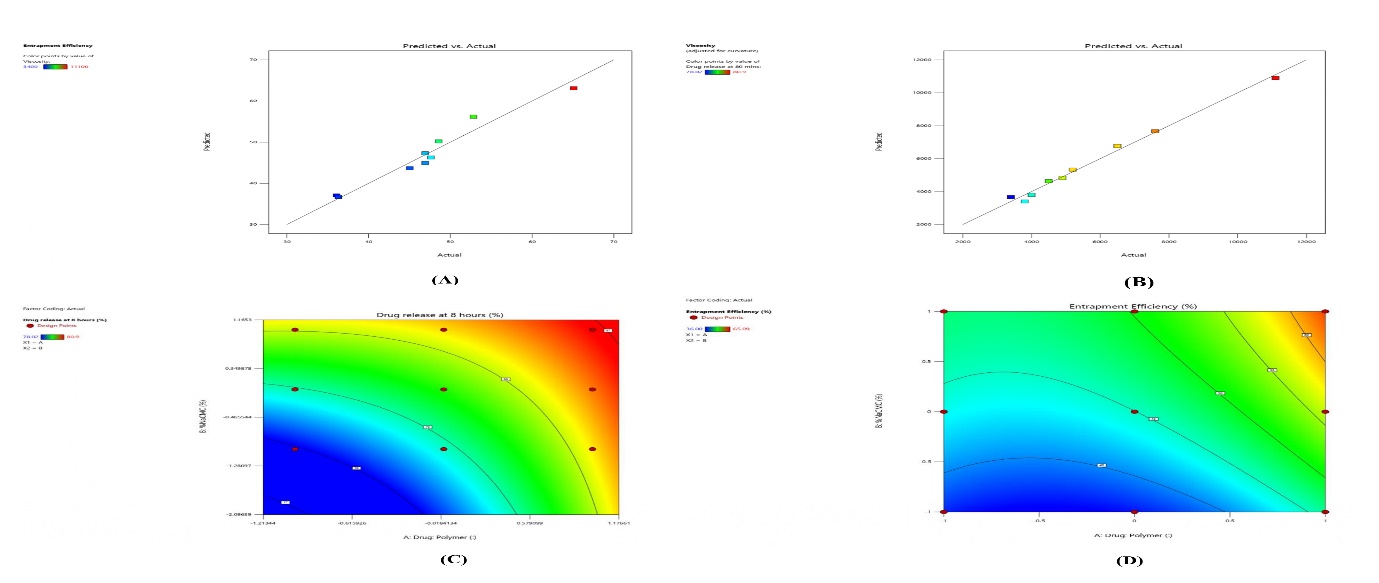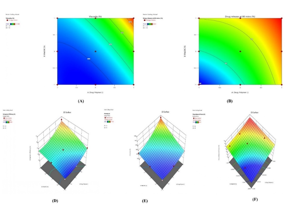 The quadratic model is used to identify how to analyze individual primary components and interaction factors utilizing the design expert program (Design Expert 11, State Ease Inc., USA). 32 full-factorial designs were used to optimize the various examined responses, each of which is represented by a quadratic as follows. The amount of CP (A) and amount of NaCMC (B) were utilized as independent variables in this full factorial design based on responses from multiple trial batches and changed at three different levels: low (-1), medium (0), and high (+1). Entrapment efficiency (%), Viscosity (cps), and percentage (%) of drug release at 8 h are the three separate response variables. The quadratic model was used to identify how to analyze individual primary components and interaction factors using the design expert software (Design Expert 11, Stat Ease Inc., USA). Using a quadratic equation, the various explored responses are indicated as follows.