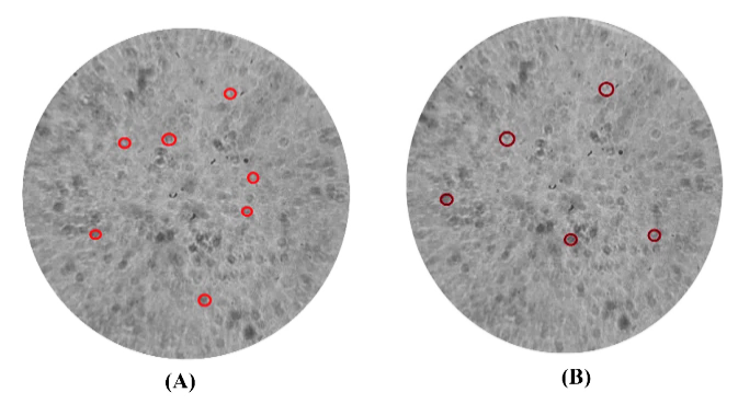 Fig. 6: (A) Visualize the particles of optimized batch (F2) Mhg-FLCZ using a binocular microscope at 1000X magnification. (B) Visualize the particles of optimized batch (F2) Mhg-FLCZ using a binocular microscope at 1500X magnification