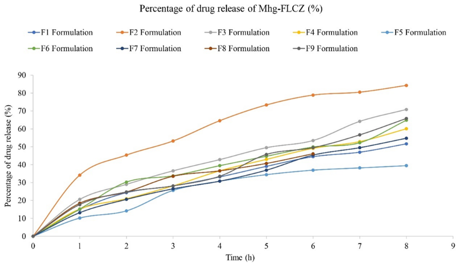 The produced Mhg-FLCZ formulation of F2 had an 8-hour drug release of 93.22% and an entrapment efficiency of 65.09±0.41%. Based on the aforementioned results, formulation F2 was found to be an optimized formulation. By using design expert trial version 13 software, optimized Mhg-FLCZ was selected for the F2 formulation because its lack of error (22.89) for the response of the dependent variables was the lowest of all comparisons with other formulations.