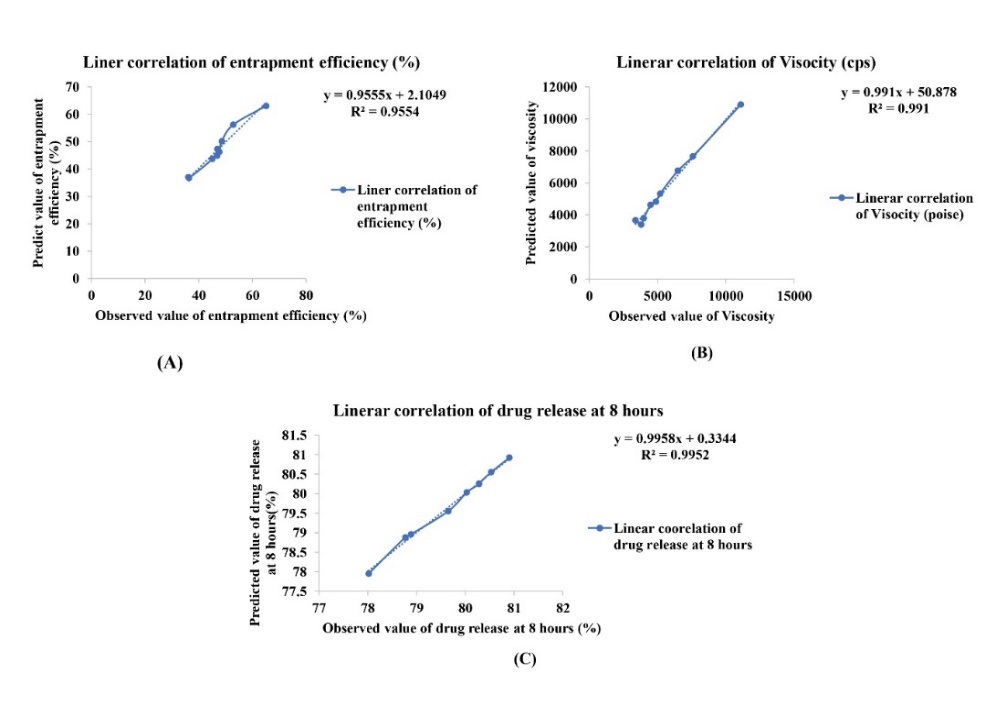 Fig. 8: (A) Graph of the linear relationship that exists between the actual and expected entrapment efficiency (%). (B) Graph of the linear relationship that exists between the actual and expected to viscosity (cps). (C) Graph of the linear relationship that exists between the actual and expected values for drug release at 8 h (%)