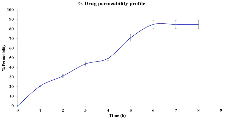 The Mhg-FLCZ gel exhibited 84.67±0.67% in an 8-hour percentage drug permeability (%) in the ex-vivo permeation testing mentioned in table no 6. Percutaneous skin permeation analysis is impacted by using the Mhg-FLCZ formulation since it has a considerably more prominent controlled release pattern and is more efficient. The Ex-vivo drug permeation study revealed that the developed formulation showed excellent drug permeation through the skin.