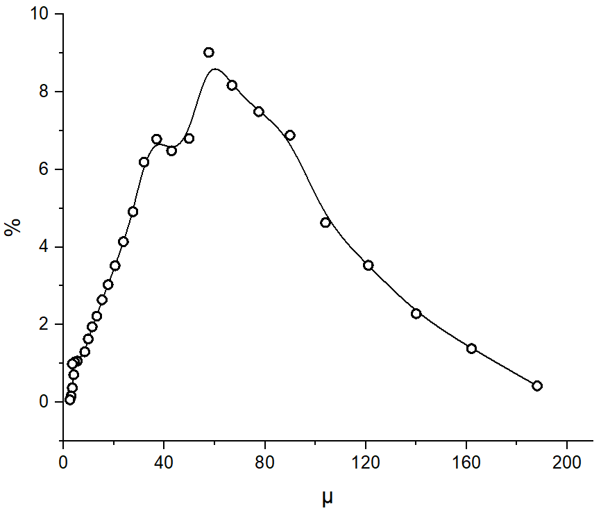 According to the results of the dispersion analysis performed applying the LALLS method, the maximum distribution was detected at 63 µm and the minor fraction at 39 µm, which allowed concluding that the raw material was homogeneous (fig. 1).