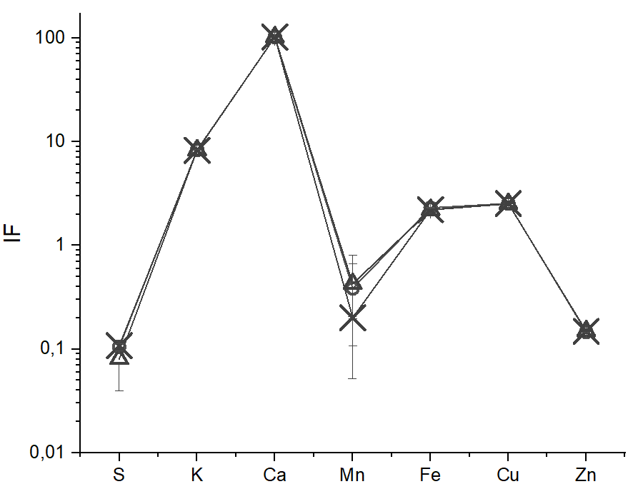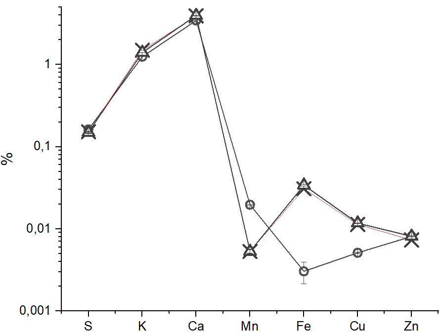 The measurements were performed in the same cell in order to avoid the influence of random factors. Elements under study: S Kα 2,31 keV; K Kα 3,31 keV; Ca Kα 3,69; Mn Kα 5,9; Fe Kα 6,40; Cu Kα 8,04 keV; Zn Kα 8,64. Study time: 50 seconds for each element.