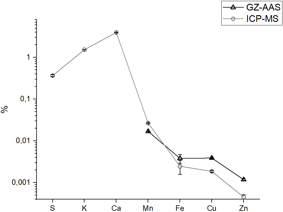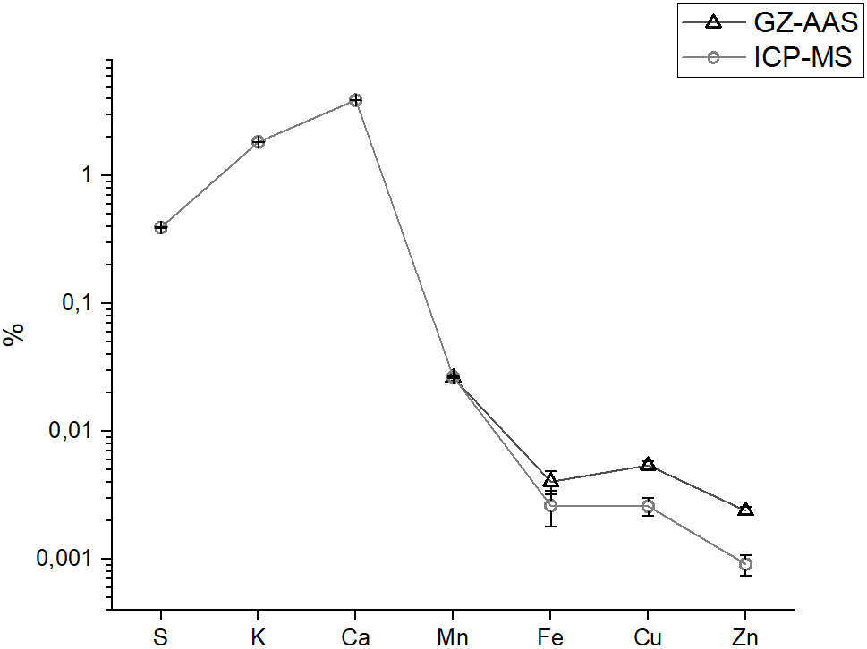 The correctness of this technique was confirmed since the presented values lie within the 95% confidence level. And amount to: S (0.149±1.71%), K (1.44±0.10%); Ca (3.97±0.27%), Mn (0.0053±4.74%), Fe (0.0317±2.44%), Zn (0.0073%), Cu (0.104±2.13%).